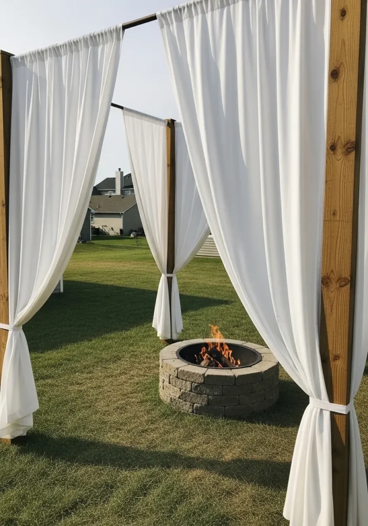 I find this idea so charming and a little romantic. The curtains transform a simple yard area into something that feels intentional and styled. I love how they create privacy without adding heavy structures. It feels like stepping into a hidden garden corner that is just for you.