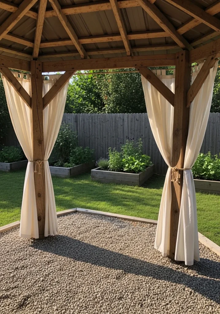 This wooden pavilion feels warm and inviting with its creamy fabric panels draped around each corner. The soft curtains hang down against the rich wood beams, creating a cozy cocoon effect without fully closing off the space. The gravel base and surrounding garden keep the look natural and grounded. Everything feels balanced between rustic and refined.
