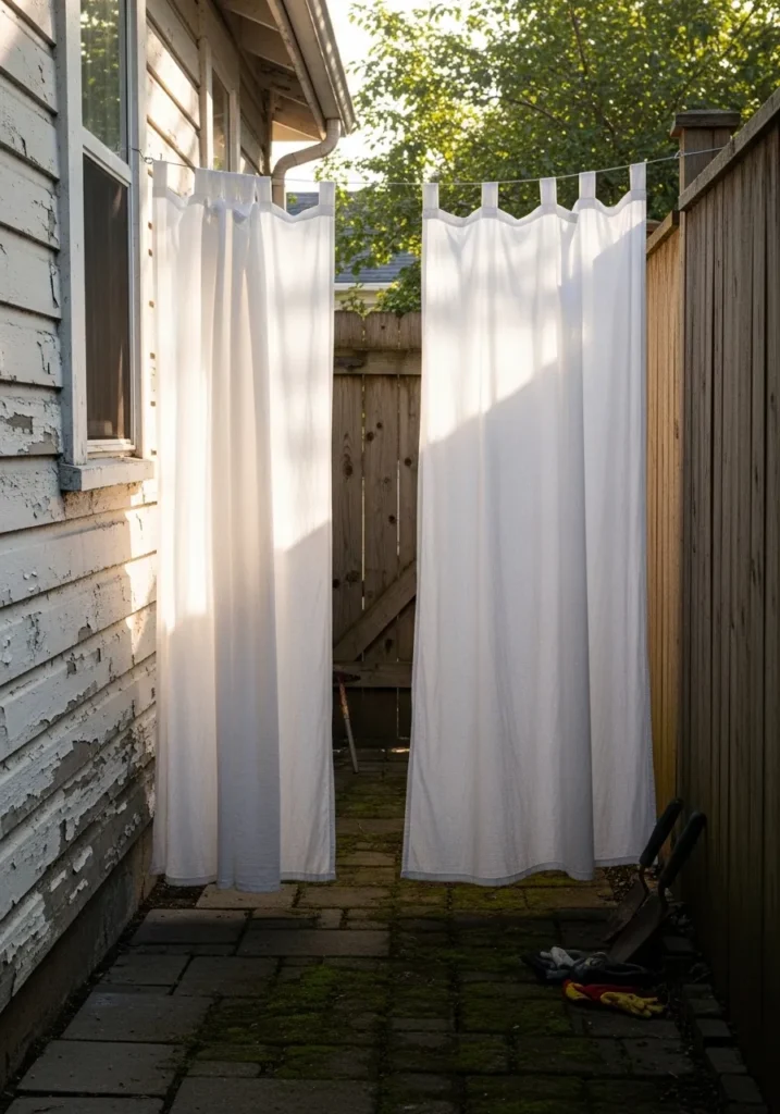 I think this idea is so smart for small spaces. It proves that you do not need a huge backyard to create privacy. The curtains make the area feel intentional instead of forgotten. I love how something so simple can make a side yard feel cozy and usable.
