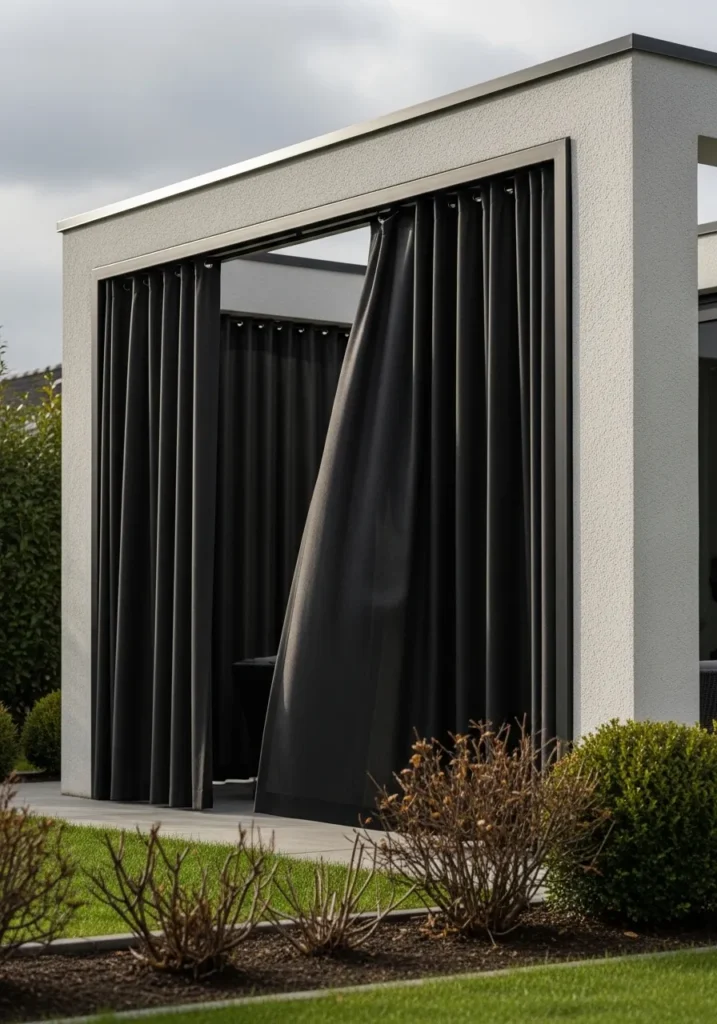 This sleek outdoor lounge features bold black floor to ceiling curtains mounted along a modern white structure. The dark fabric creates a striking contrast against the light exterior walls and surrounding greenery. The panels slide easily to reveal or conceal the seating area, making the space adaptable and private. The clean architecture paired with the rich drapery gives the patio a contemporary, almost boutique hotel vibe.