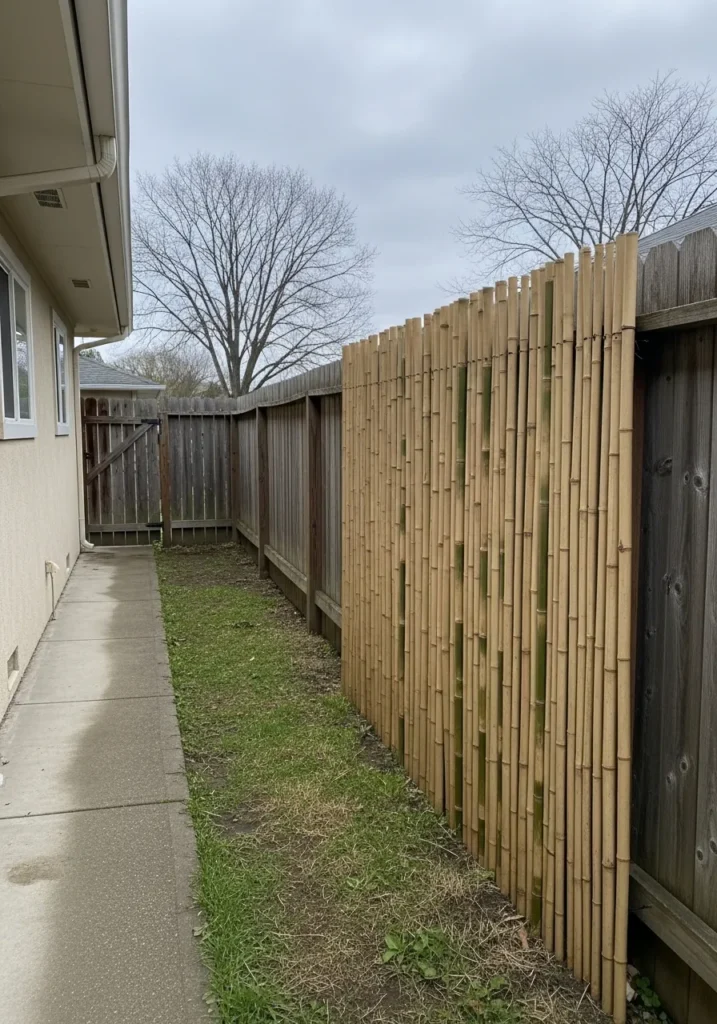 This design uses vertical bamboo panels attached directly to an existing fence line to create instant privacy along a narrow side yard. The bamboo has a soft natural tone that warms up the space and adds texture without feeling heavy. It is simple, lightweight, and perfect for tight outdoor areas where bulky structures would feel overwhelming.