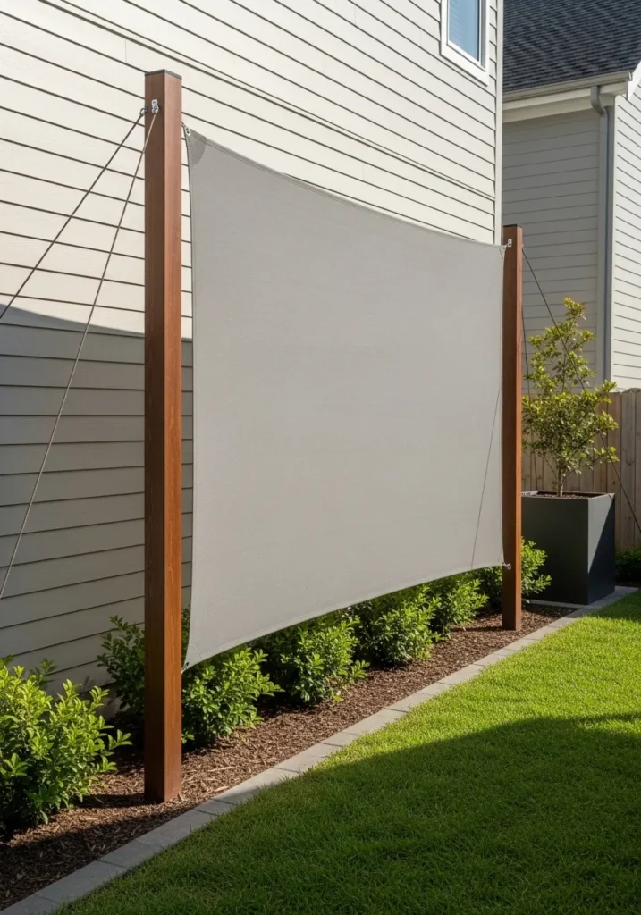 This design uses a stretched fabric screen secured between sturdy wooden posts along a lawn edge. The soft neutral fabric contrasts nicely with the clean lines of the posts. It creates instant privacy while still feeling light and approachable.