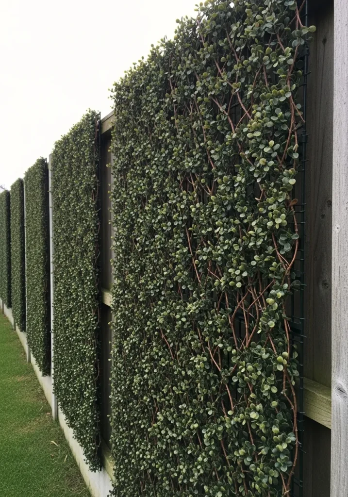This option uses artificial hedge panels mounted vertically to form a dense green privacy wall. The uniform greenery creates full coverage and works especially well along fences or property lines. It offers privacy without ongoing maintenance.