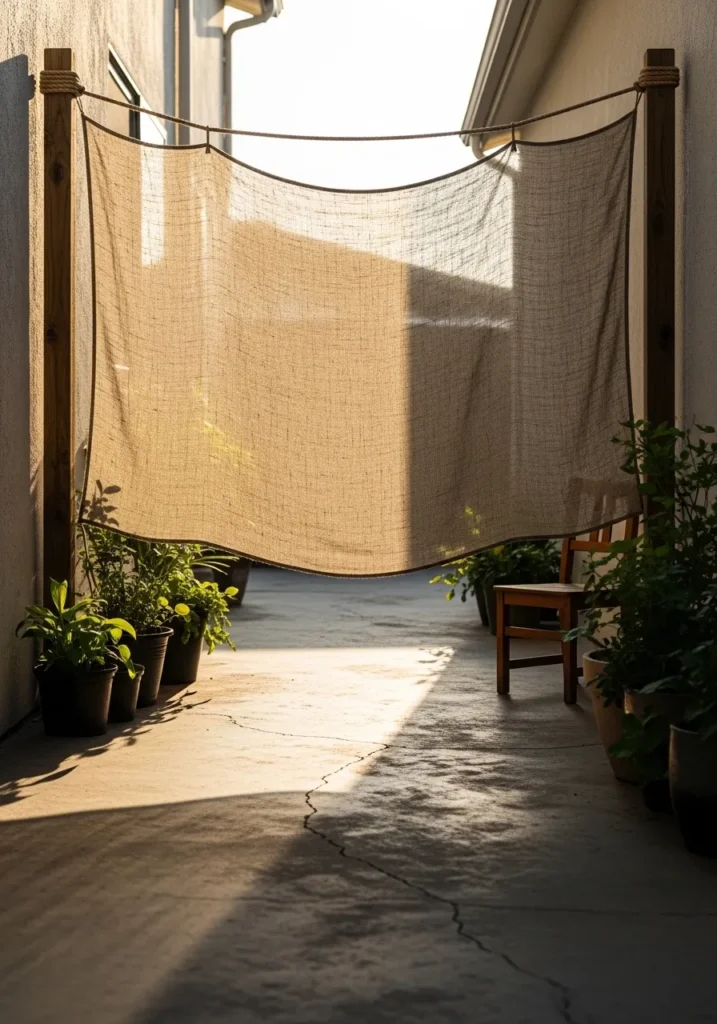 This design features a loosely hung outdoor fabric panel draped between posts to block views along a patio walkway. The fabric filters sunlight and creates gentle movement in the space. It feels relaxed and slightly bohemian.