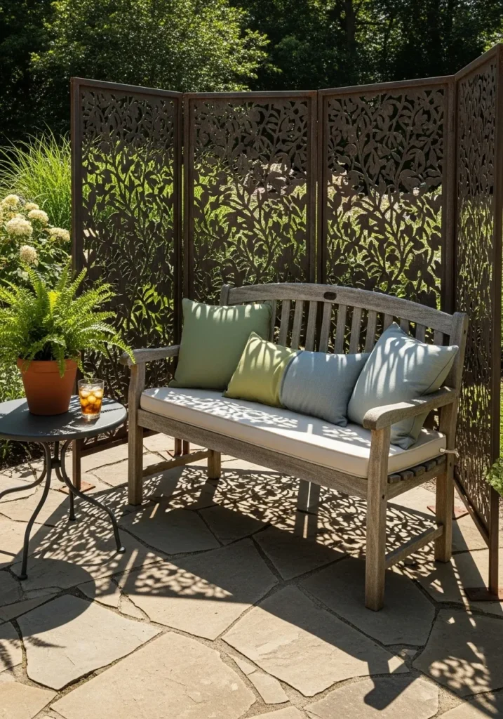 This design uses an ornate metal screen placed behind an outdoor bench to create privacy with a decorative touch. The cutout pattern lets sunlight filter through while still blocking direct sightlines. It feels sturdy yet elegant and works beautifully in garden seating areas.