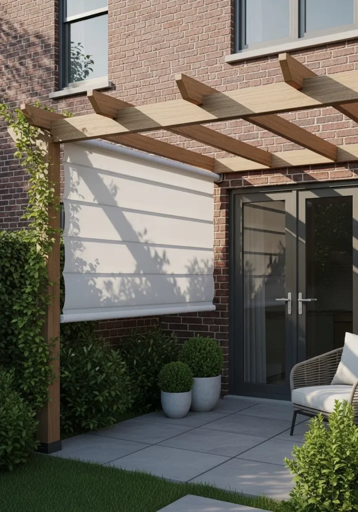 This setup features a fabric screen attached to a pergola frame, creating shade and privacy along a patio wall. The neutral fabric blends seamlessly with the wood structure and soft landscaping. It feels clean and modern while still being very approachable.