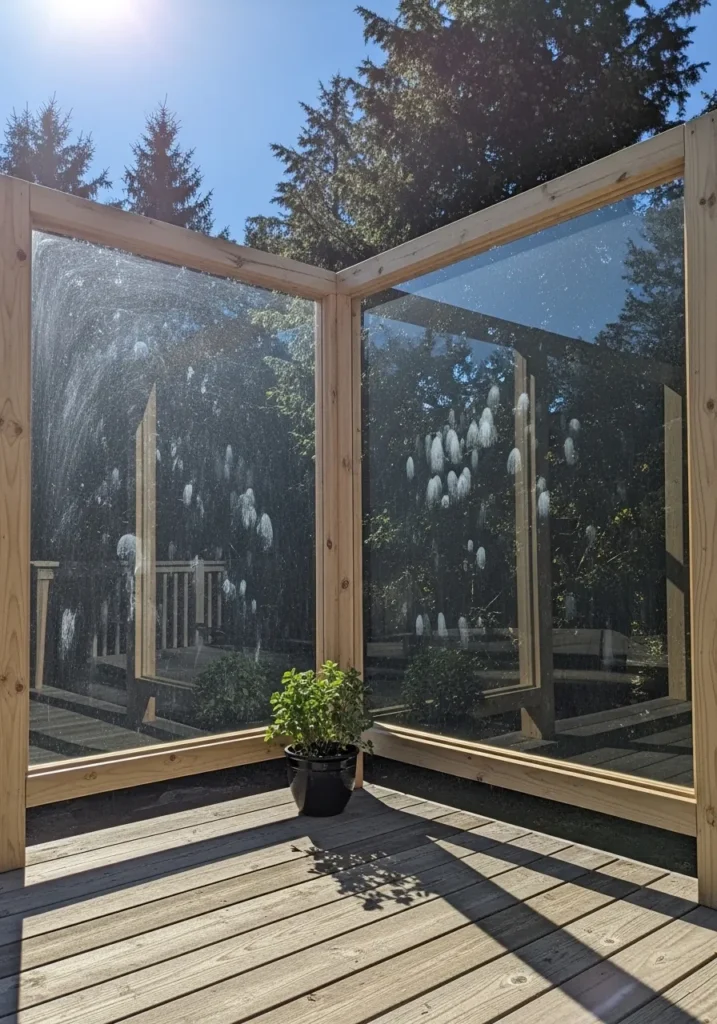 This design uses clear panels framed in wood to create a corner privacy screen on a deck. The panels block wind while still allowing light and views of the surroundings. It feels modern and airy without closing the space off.