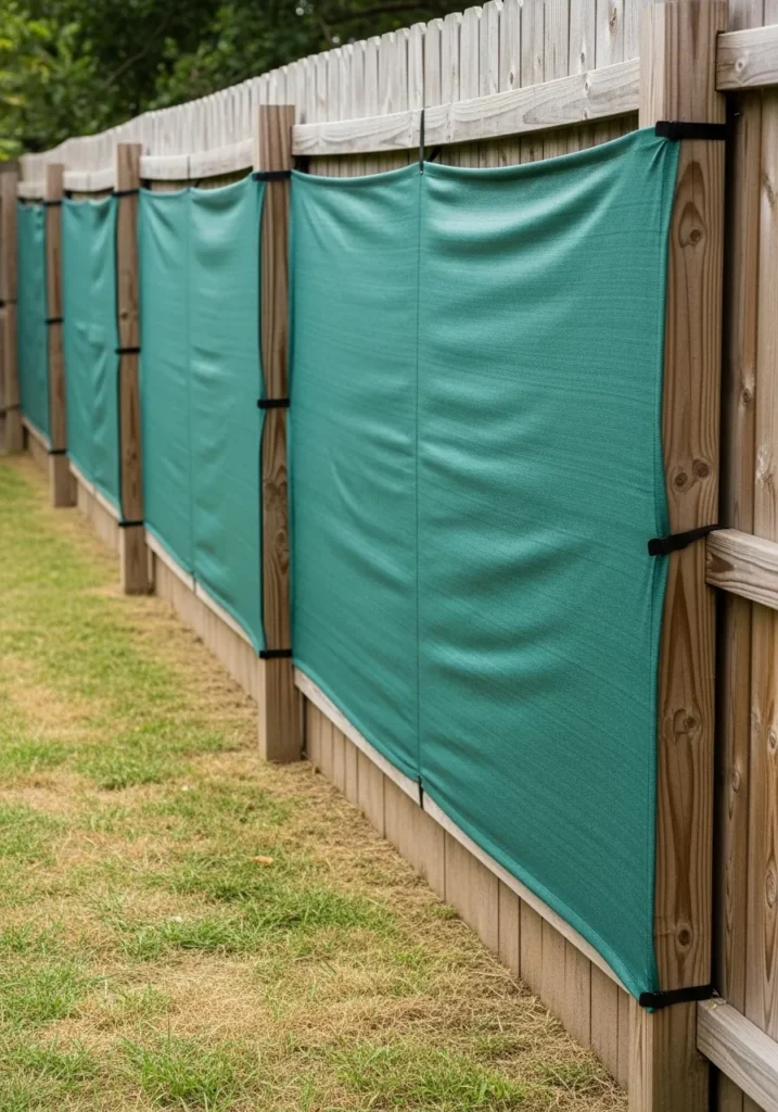 This design uses durable fabric panels attached directly to a fence for instant privacy. The bold color adds personality while the fabric blocks views completely. It is practical and easy to install or remove.