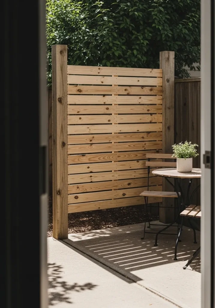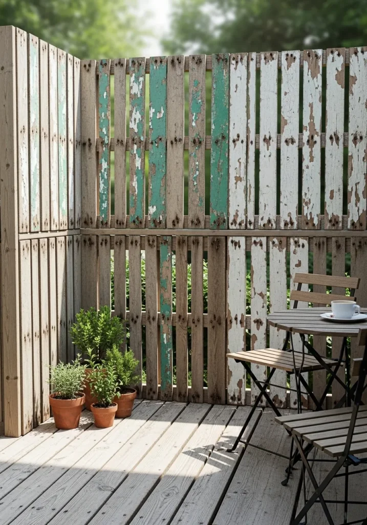 This design uses reclaimed wood pallets arranged vertically to form a rustic privacy screen around a small patio area. The weathered wood adds texture and character while still providing solid coverage. It feels casual and creative and works well in compact outdoor spaces.