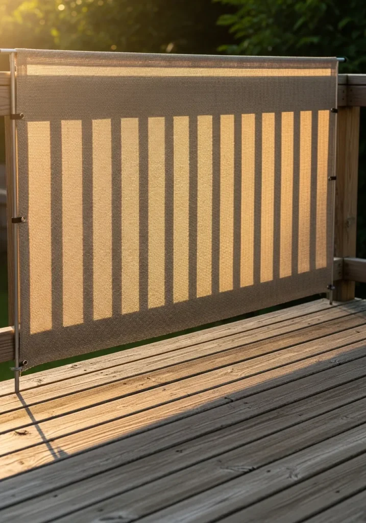 This setup features a sleek outdoor fabric panel stretched across a deck railing for quick and flexible privacy. The neutral woven material filters light beautifully while still blocking unwanted views. It feels airy and modern and works especially well for small decks or balconies.