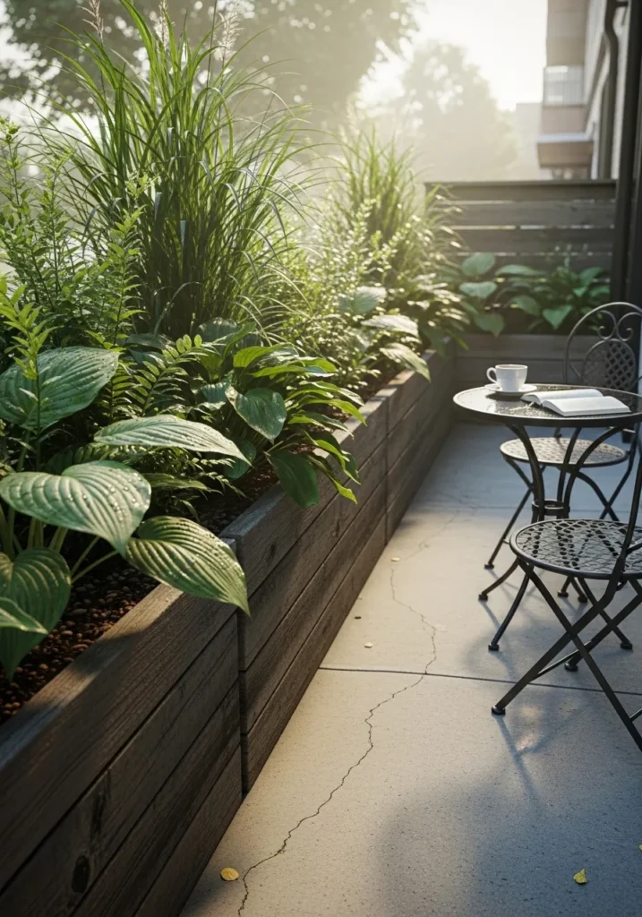 Here the privacy comes from a tall built in planter filled with lush greenery along a patio edge. The plants act as a natural screen while adding life and color to the space. It creates separation without feeling closed off and works well in compact outdoor areas.