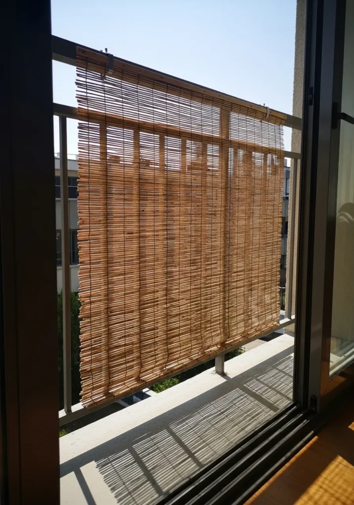 This design uses a roll up bamboo shade mounted along a balcony or patio opening. The woven bamboo allows light to pass through while still creating a sense of enclosure. It can be rolled up or down depending on the time of day and privacy needs.