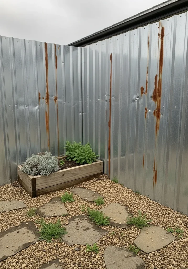 This idea uses corrugated metal sheets installed vertically to create a sturdy privacy wall. The weathered finish adds an industrial edge while still feeling intentional and modern. It works well in small outdoor corners that need full coverage and durability.