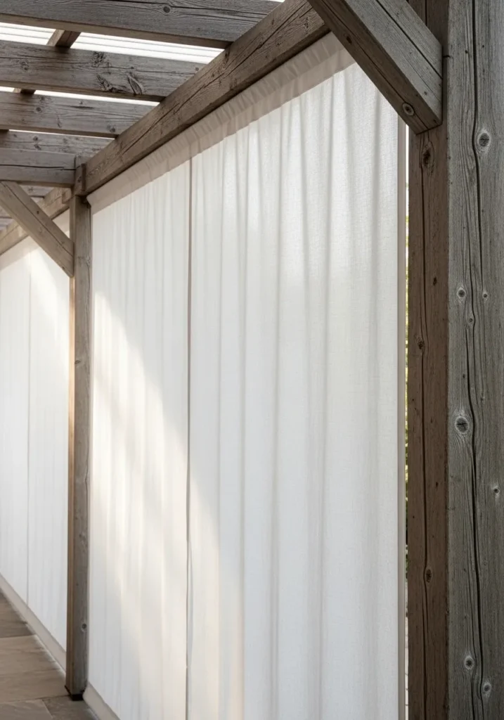 This design features lightweight outdoor curtains hung from a simple pergola frame. The fabric creates instant privacy while still letting light filter through. It adds softness and movement to the space and feels very relaxed.