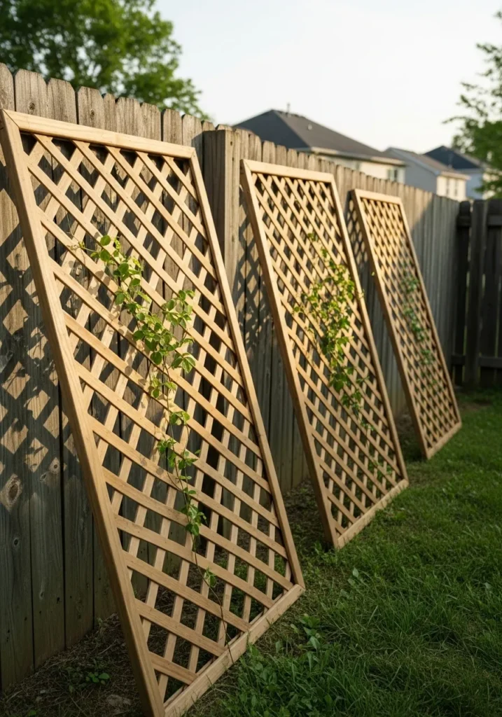 This setup uses tall wooden lattice panels leaned gently against an existing fence to create quick privacy without permanent installation. The crisscross pattern keeps the space feeling open while still blocking direct views. It is a great option for renters or anyone who wants something easy to move or adjust.