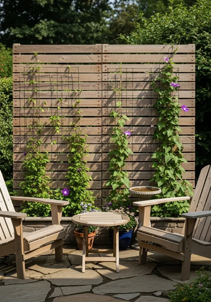 I love how this combines privacy and garden vibes in one go. Watching plants grow up a screen like this always feels rewarding. It turns a simple seating area into a cozy little outdoor retreat.