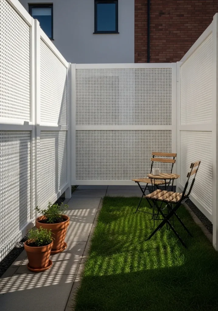 Here we see tall white perforated panels creating a clean and modern privacy wall in a narrow yard. The tiny openings allow light and airflow while still giving a strong sense of separation. It feels fresh and minimal without being cold.