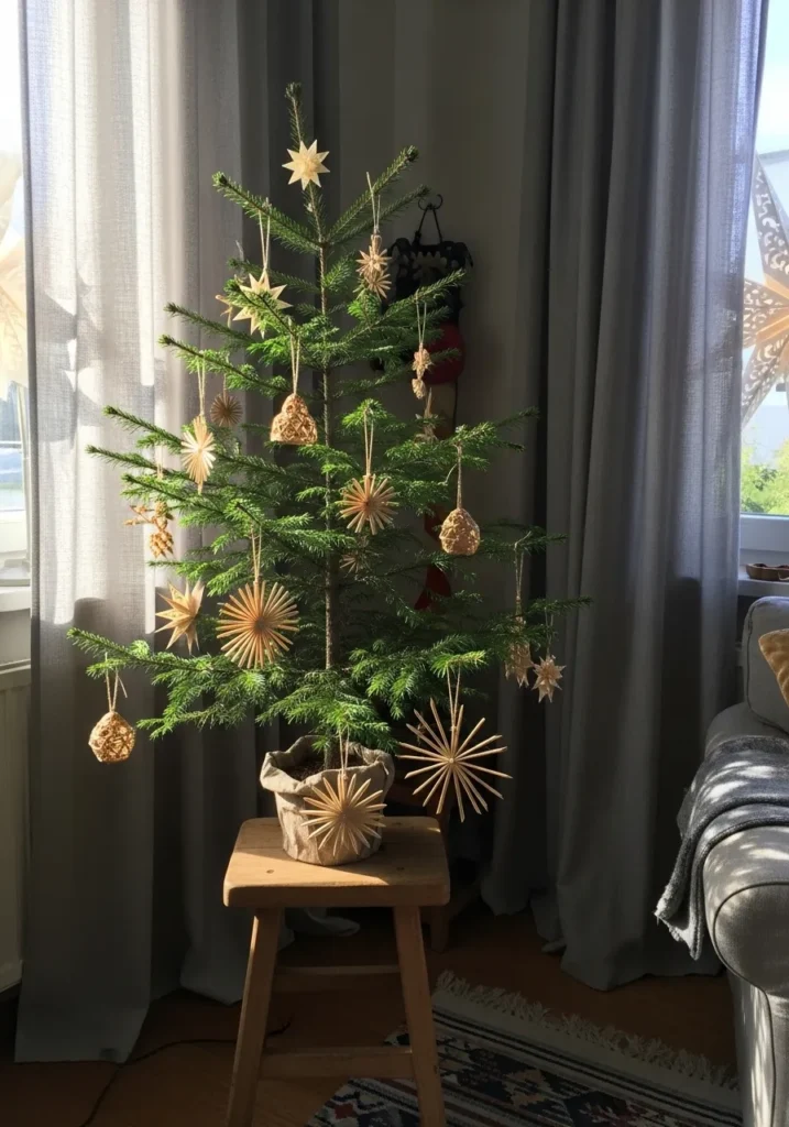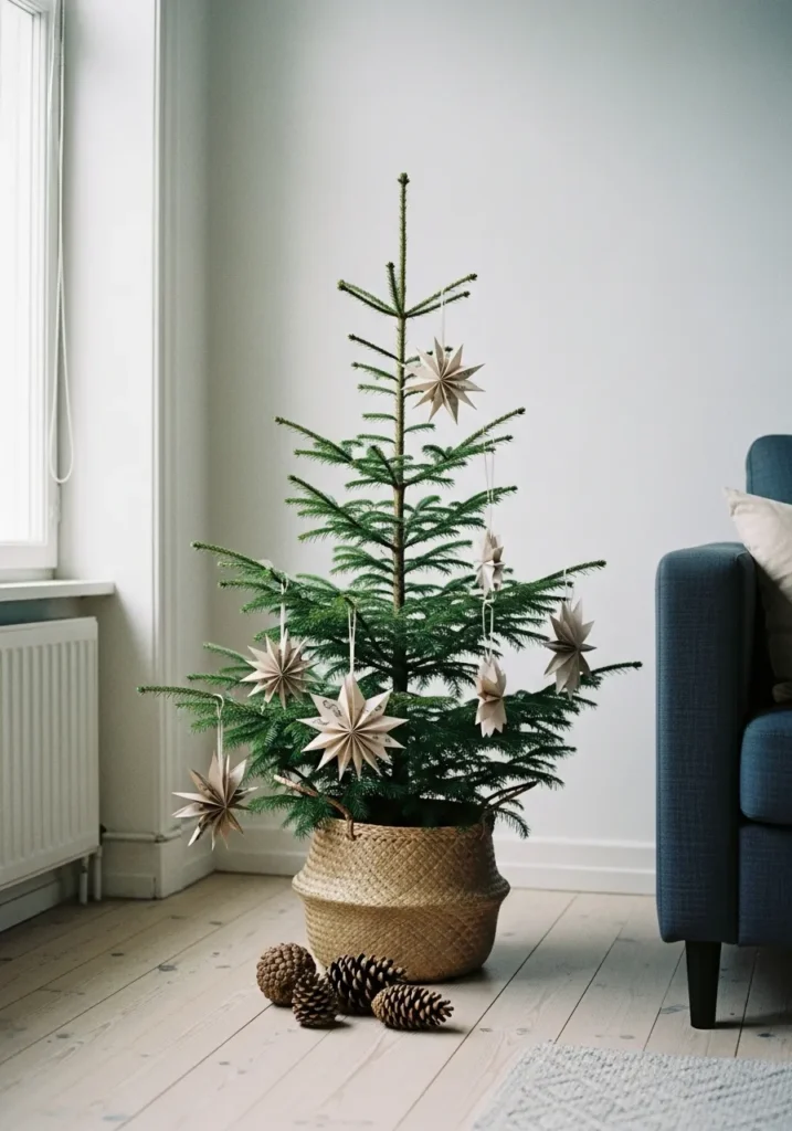 This cozy corner features a petite Christmas tree dressed in simple yet striking handmade paper stars. Set in a woven basket, the tree exudes effortless Scandinavian charm with its clean lines, natural materials, and minimalist aesthetic. The soft light streaming through the window highlights the muted tones and organic textures, creating a calm and inviting holiday atmosphere.