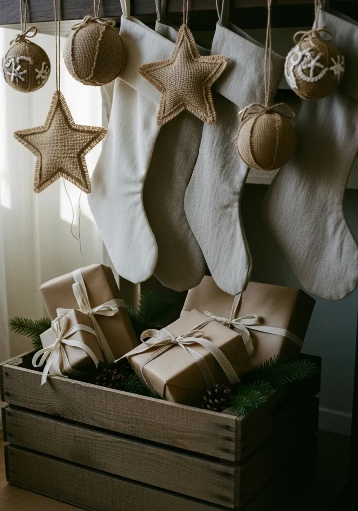 Here’s a cozy display that pairs burlap stars and fabric-covered ornaments with cotton stockings in creamy tones. The wooden crate filled with wrapped gifts ties everything together, giving off that “quiet Christmas morning” feeling. It’s soft, tactile, and completely plastic-free.