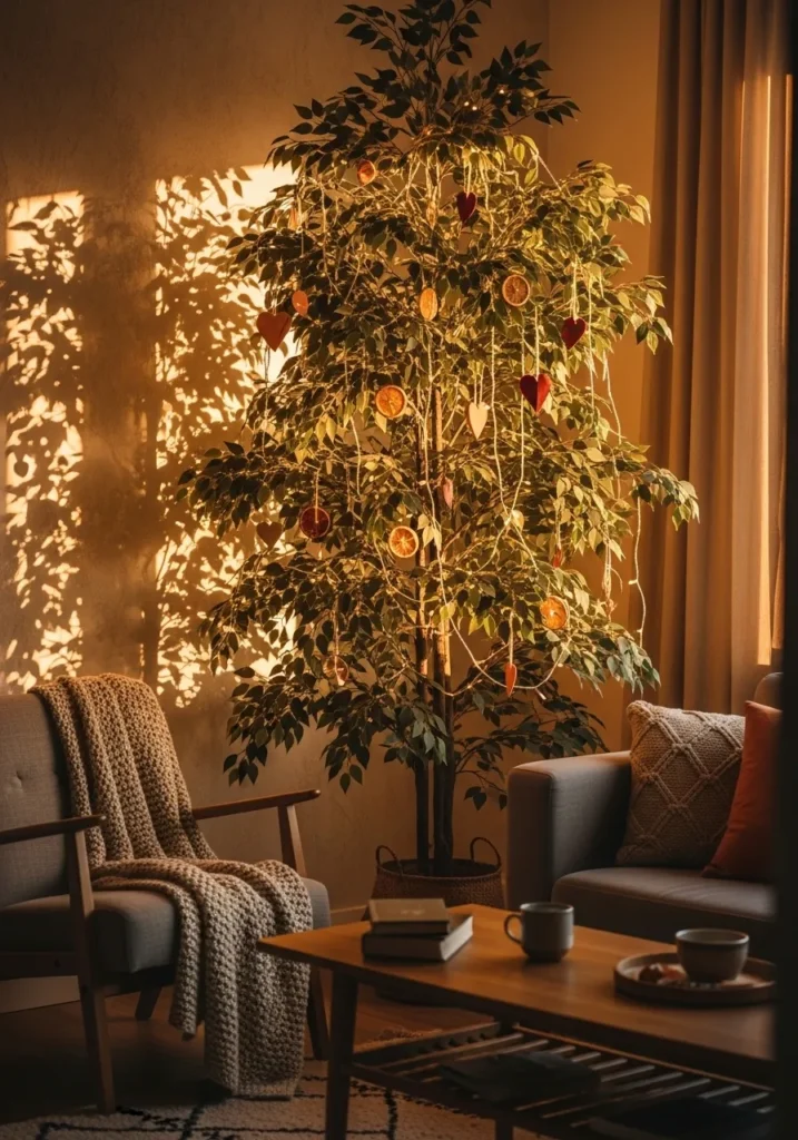 This creative setup replaces the traditional Christmas tree with a lush indoor plant decorated with dried orange slices and heart-shaped ornaments. The warm sunlight filters through the room, casting golden shadows that make everything feel magical.