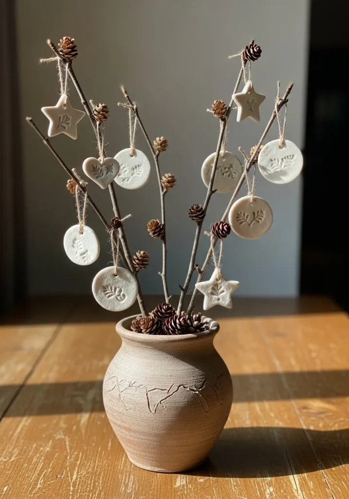 This handmade arrangement of white clay ornaments hanging from bare branches feels beautifully minimalistic. The pinecones tucked into the clay pot add texture and a nod to nature, while the soft sunlight enhances the organic tones.