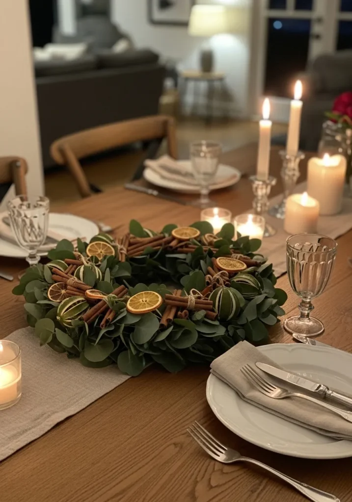 This lush wreath doubles as a stunning table centerpiece made from eucalyptus leaves, dried oranges, and cinnamon sticks. The mix of green foliage and warm tones from the citrus gives it a fresh yet cozy feel, while the candles around it make the whole table glow softly.