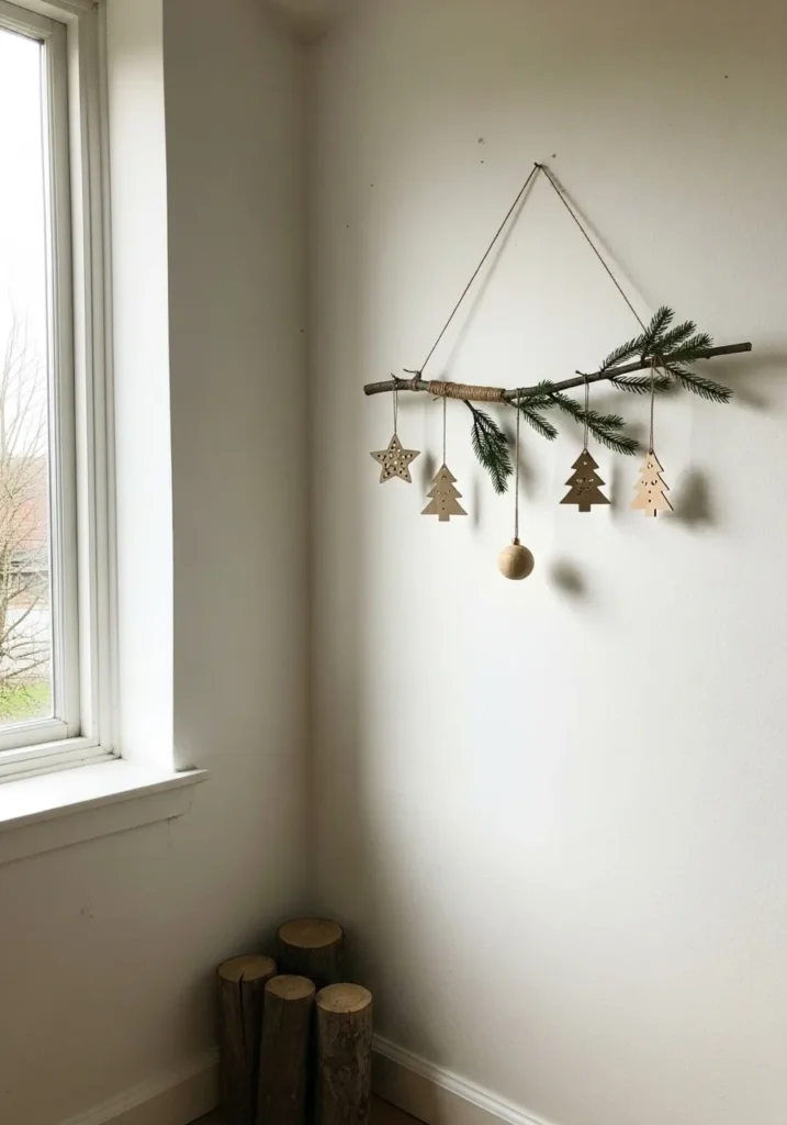 A simple branch transformed into an elegant wall hanging makes this design feel so light and effortless. The small wooden ornaments shaped like stars and trees, paired with a touch of pine greenery, create a perfect balance of minimalism and warmth.