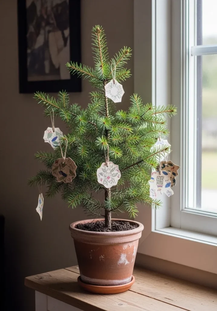I find this idea so charming because it’s both simple and meaningful. A small tree like this doesn’t take up much room, but it still brings that classic Christmas feeling. Plus, those paper ornaments look like something made on a quiet afternoon with a cup of cocoa nearby.