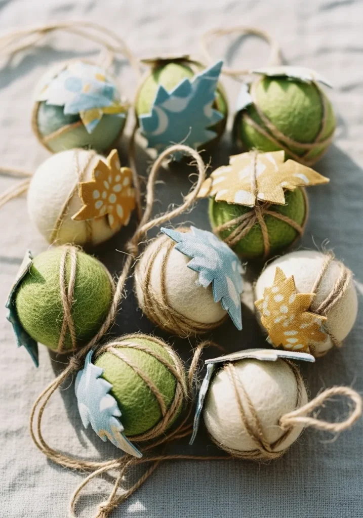 Soft felt balls in shades of cream and green, tied with bits of printed fabric and jute string, bring a cheerful handmade touch. They have a nostalgic, almost storybook quality that feels cozy and comforting.