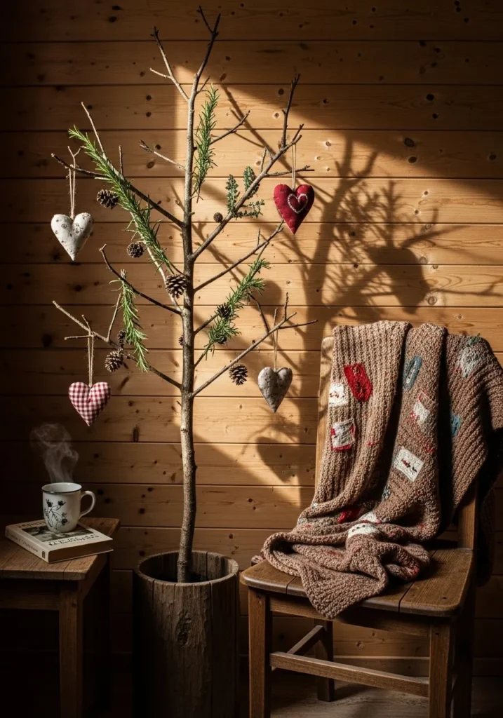 This cozy little setup features a bare branch tree decorated with handmade heart ornaments and tiny pinecones. The wooden backdrop and knitted throw make the entire scene glow with natural warmth and texture.