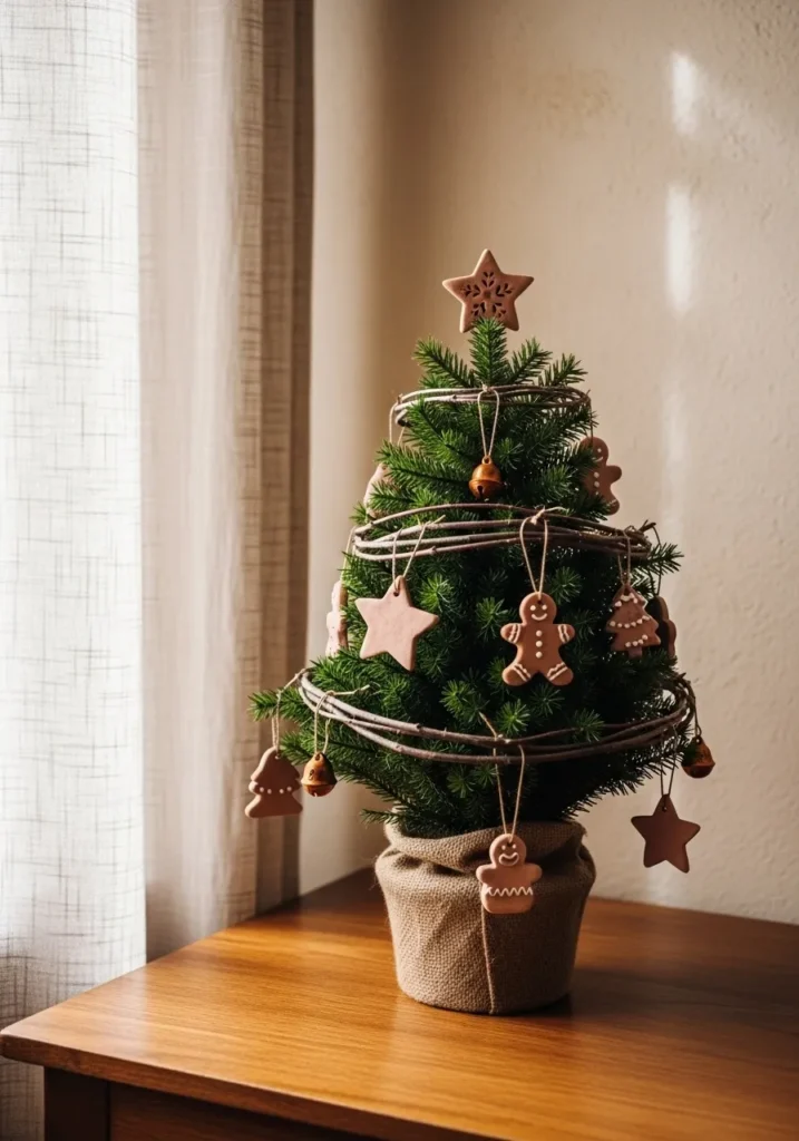 This small Christmas tree brings together earthy tones and handmade clay ornaments in the sweetest way. Tiny gingerbread men, stars, and bells hang from natural twine, while the tree itself sits snugly wrapped in burlap. The soft morning light gives it a nostalgic, homemade glow that instantly warms up the room.