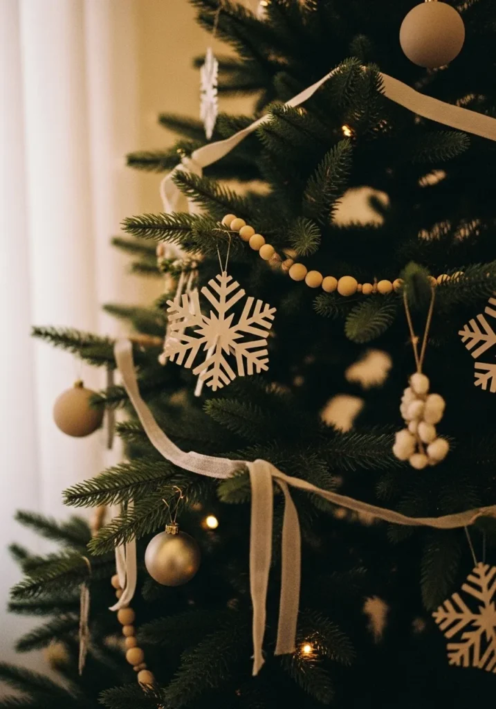This elegant Christmas tree embraces a neutral palette with soft beige ornaments, wooden beads, and paper snowflakes that feel as light as winter air. A simple fabric ribbon drapes gently around the branches, adding movement and softness without overwhelming the natural greenery.