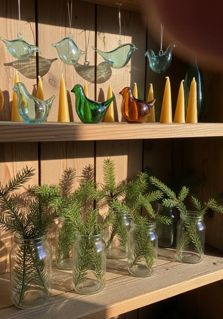 This cozy shelf display captures the beauty of simplicity with delicate handblown glass bird ornaments glimmering in soft daylight. Each glass bird, in hues of amber, green, and aqua, feels timeless and handcrafted, perfectly paired with beeswax candles and sprigs of evergreen nestled in small glass jars. The natural textures of wood and glass blend effortlessly, creating a holiday scene that feels warm, minimal, and refreshingly organic.