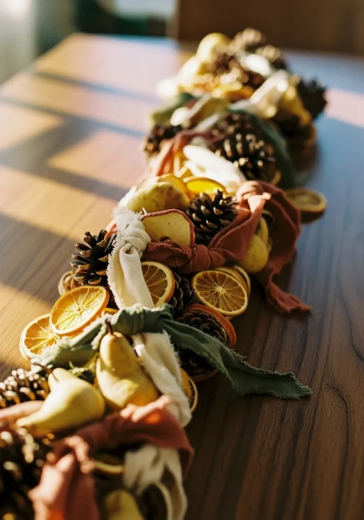 This natural garland is a feast for the senses with its mix of dried oranges, apples, pinecones, and soft fabric ties in earthy tones. Draped across a wooden table, it radiates a rustic warmth that’s both festive and sustainable. The colors—golden citrus, deep brown pine, and muted greens and reds—create a cozy palette that feels straight out of a countryside Christmas kitchen.