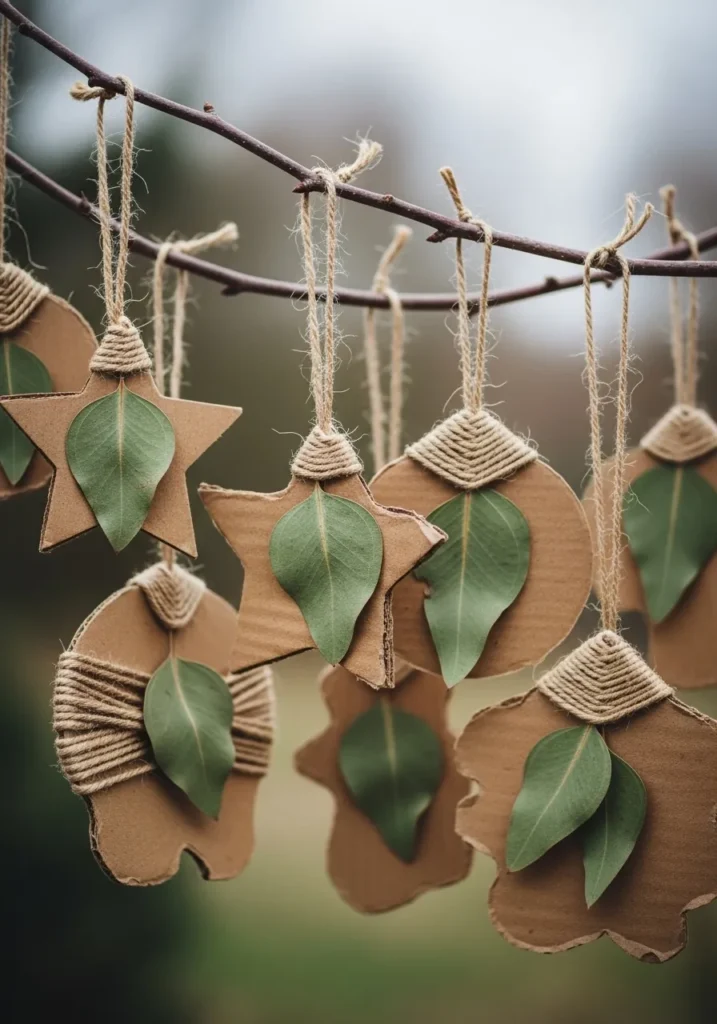 These handmade ornaments mix recycled cardboard, twine, and natural leaves in the most charming way. Each piece feels earthy and grounded, with soft neutral tones and a texture that looks straight out of a cozy winter craft afternoon. The way the jute twine wraps around the top adds that perfect touch of rustic simplicity that pairs beautifully with greenery.