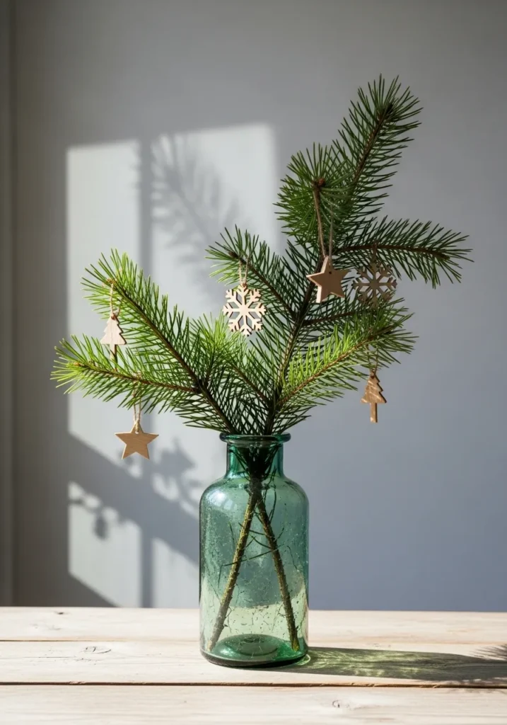 This setup uses a few pine branches placed in a recycled green glass jar, turning simplicity into elegance. The wooden ornaments hanging from the needles add a subtle Scandinavian touch that feels both modern and timeless. Sunlight streaming through the window enhances the clean, natural vibe.