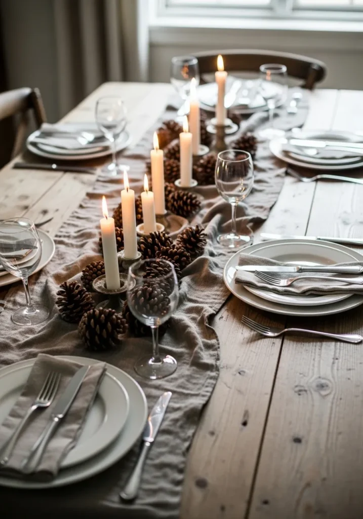 This table setting captures the cozy heart of winter with its simple beauty. A soft linen runner drapes loosely across the wooden surface, dotted with tall white candles and clusters of pinecones. The flickering flames reflect gently on the glassware, while the natural tones of beige and brown create a relaxed and organic feel.