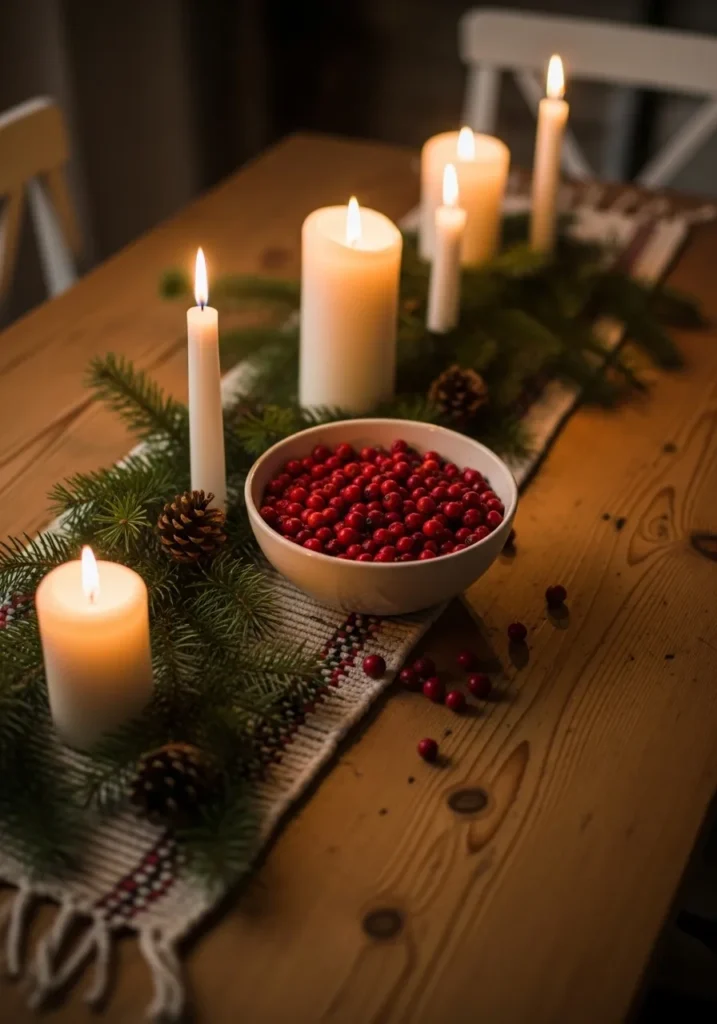 This setup captures the warmth of the season with its natural details. A wooden table is decorated with sprigs of pine, chunky candles, and a simple bowl of cranberries that adds a burst of red against the greenery. The whole look feels relaxed yet festive, like a cozy evening by the fire.