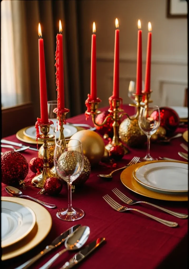 This dramatic table setting is full of confidence and sparkle. Tall red candles stand proudly among glittering ornaments and polished gold chargers. The deep red tablecloth ties everything together, creating a warm, glowing look that feels made for a festive evening.