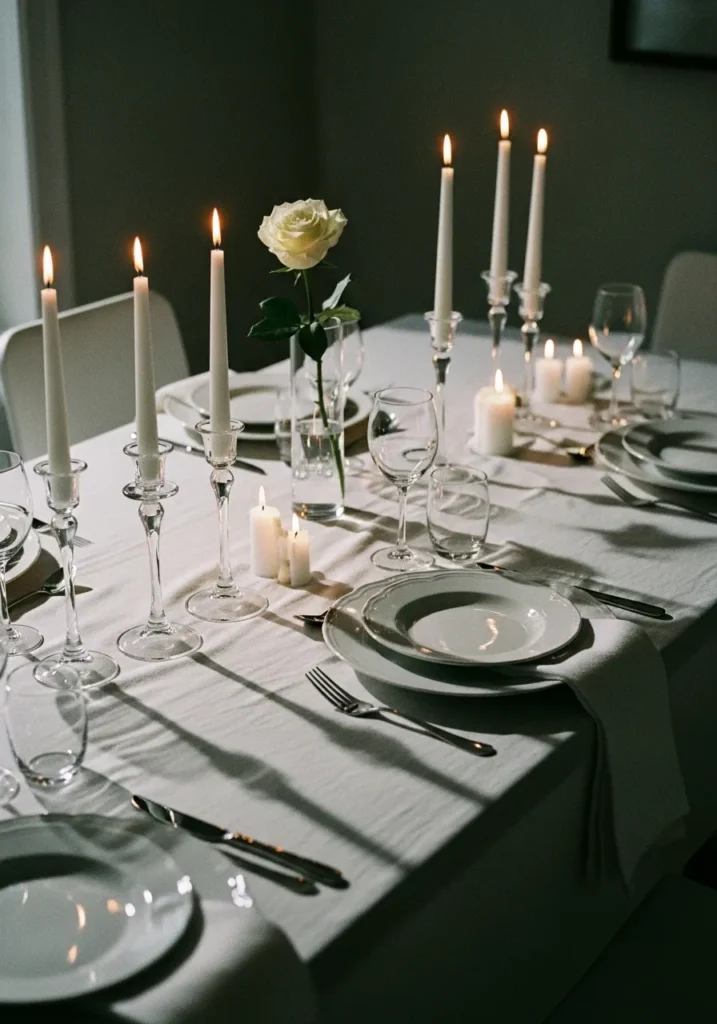 This minimalist table keeps the focus on clean lines and gentle candlelight. White tapers in clear holders are arranged in perfect balance, while crisp linens and simple dinnerware create a calm, sophisticated scene. The single white rose in a glass vase adds just the right amount of softness.