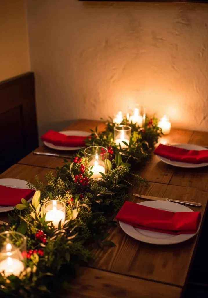This glowing table feels like Christmas brought to life. Glass-encased candles are surrounded by lush greenery and bright red berries, creating a soft, flickering path down the center. Red napkins add a pop of cheer that completes the classic holiday palette.