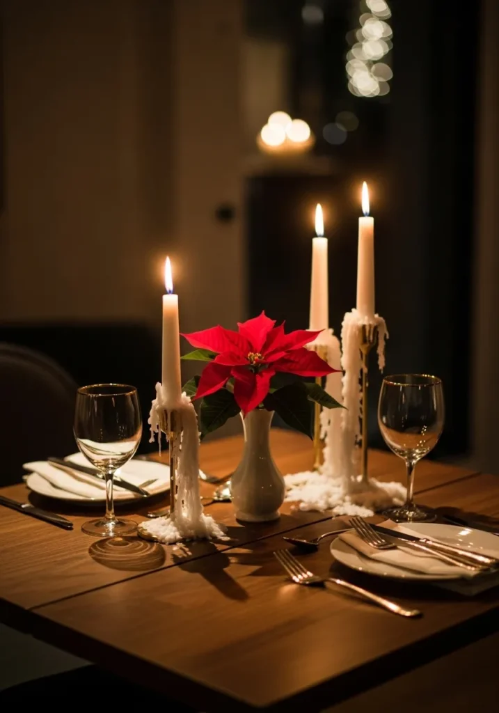 This intimate table setting celebrates the beauty of simplicity. A small white vase holds a single red poinsettia, surrounded by tall white candles that drip gently onto the wooden surface. The scene feels calm, romantic, and perfectly suited for a quiet Christmas dinner.