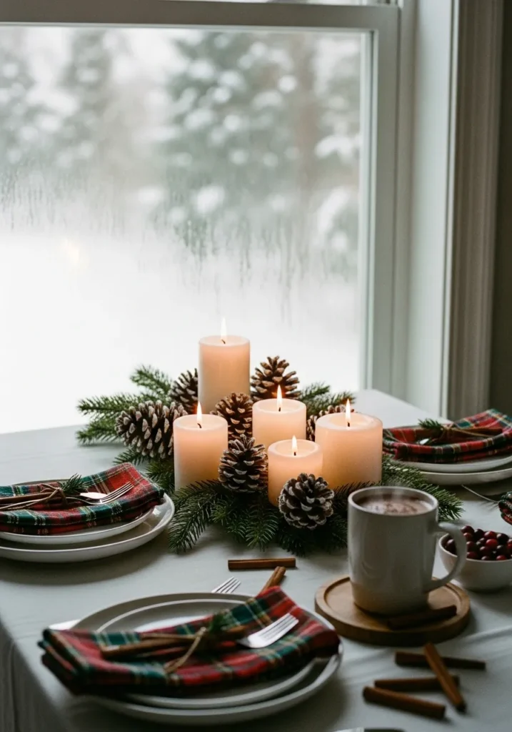 This charming setup feels like a scene from a snowy Christmas morning. Pillar candles are surrounded by pinecones and evergreen branches, while red plaid napkins bring a cheerful pop of pattern. The soft winter light streaming through the frosty window completes the cozy vibe.
