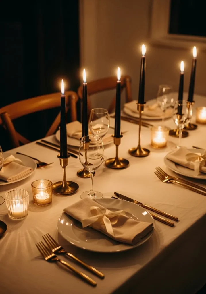 This elegant setup takes a bold approach with tall black candles in gold holders, adding a rich contrast against the creamy white tablecloth. The flicker of candlelight bounces off the brass tones, creating a moody and luxurious atmosphere. Every detail, from the tied napkins to the crystal glasses, feels carefully chosen for drama and sophistication.