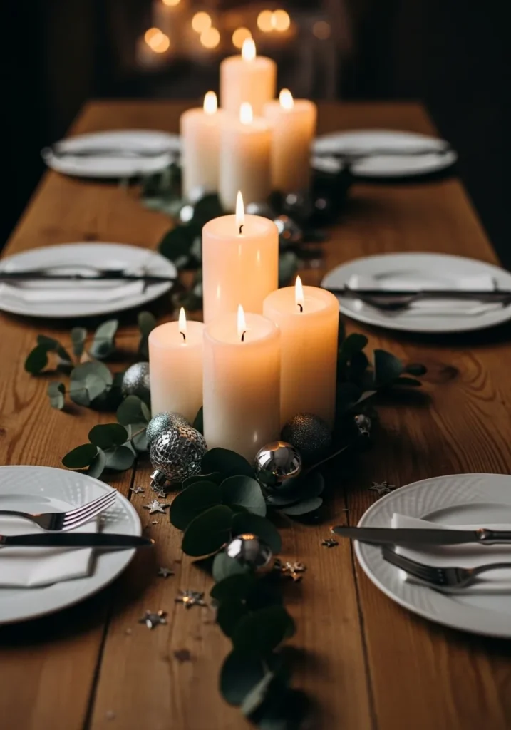 This table brings a soft, inviting glow to the evening. Thick pillar candles line the center, surrounded by eucalyptus leaves and silver ornaments. The mix of greenery and candlelight gives the space a peaceful, wintery charm that feels calm and comforting.