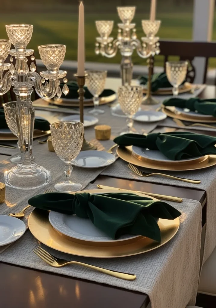 I think this design is breathtaking because it feels both formal and welcoming. The gold and green palette never goes out of style, and the glimmer of crystal adds just the right amount of sparkle for a memorable dinner.