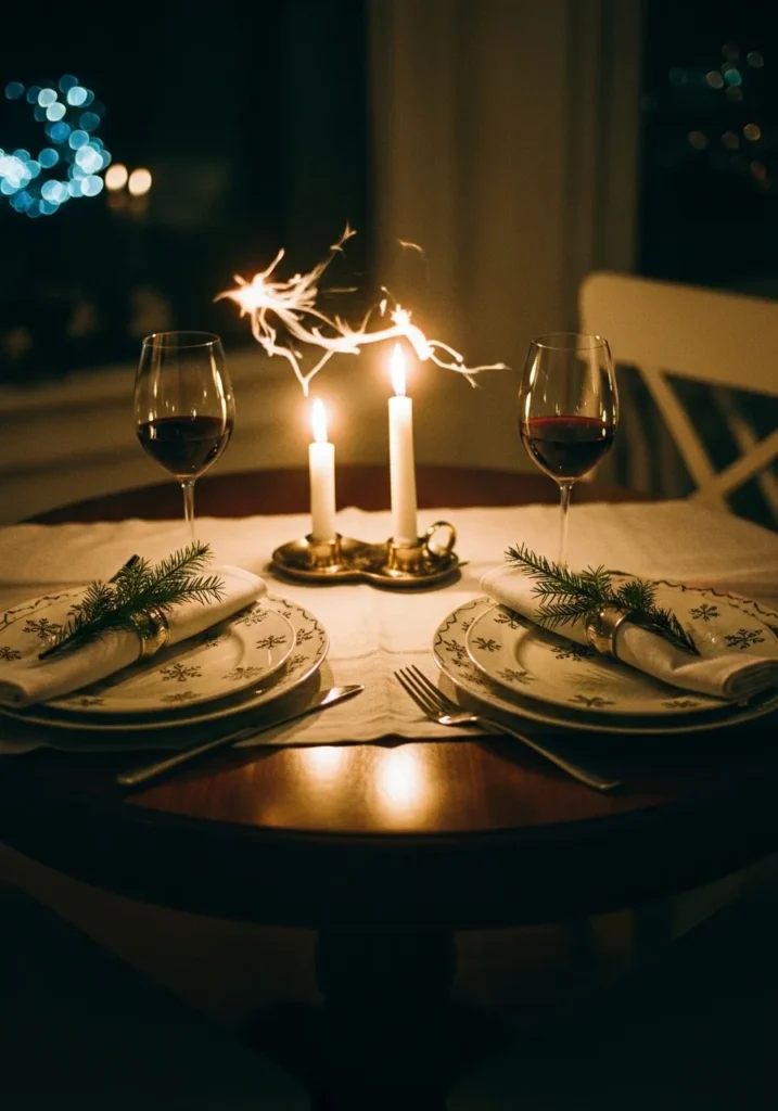 This romantic setup features a small round table with two place settings, each decorated with snowflake-patterned plates and a sprig of evergreen. Two candles in brass holders flicker gently between glasses of red wine, setting the mood for a quiet Christmas evening.