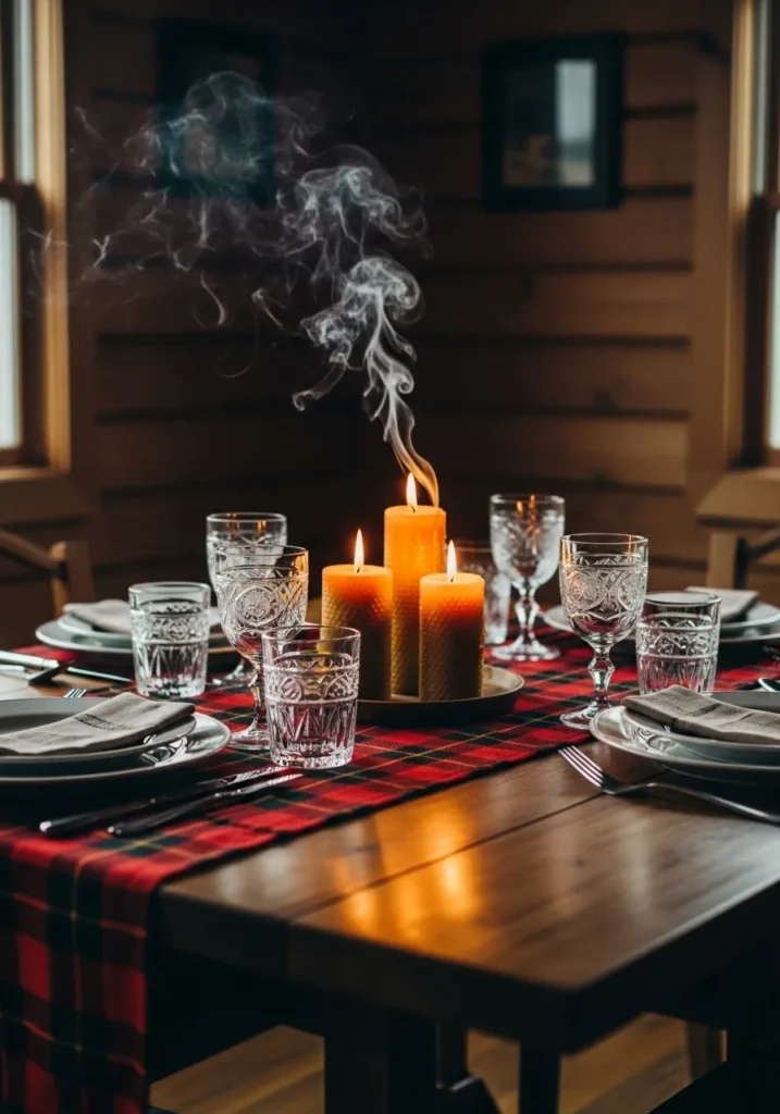 This setting feels straight out of a winter cabin. A red plaid table runner brings color and pattern, while thick beeswax candles flicker warmly at the center. The wooden table and crystal glasses complete the rustic yet polished atmosphere.