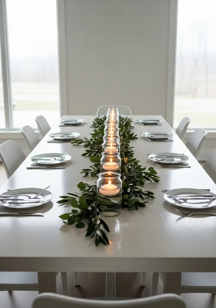This sleek setup keeps things simple and stylish. A crisp white table is lined with glass jars, each holding a floating candle surrounded by a garland of fresh greenery. The symmetry and clean lines create a calm, modern mood that still feels festive.