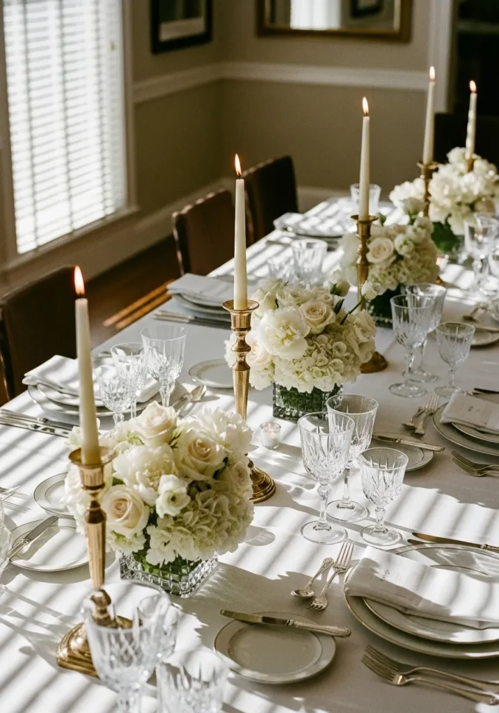 This table setting feels effortlessly refined, with tall taper candles glowing softly among bouquets of white roses and hydrangeas. Crystal glassware sparkles under the light, while golden candleholders add a timeless touch. The entire setup exudes understated luxury, creating an atmosphere that feels both elegant and inviting.